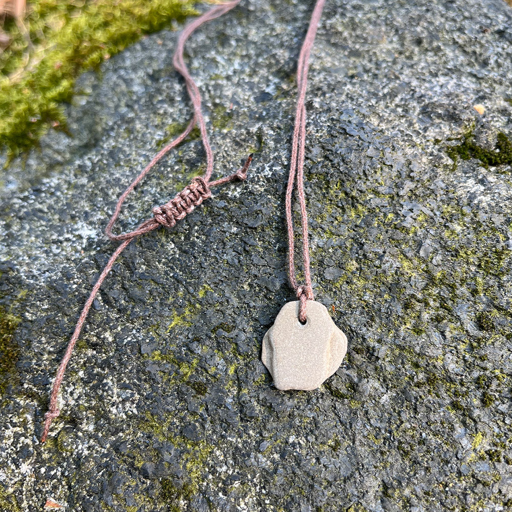 Każdy kamień został własnoręcznie zebrany przez założyciela projektu, Macieja, i jego żonę Joannę podczas ich wspólnych wędrówek, podróży i chwil blisko natury. Każdy naszyjnik ma w sobie wyjątkową historię miejsca. Ręcznie oprawiony w regulowany, trwały sznurek (różne kolory do wyboru), tworzy naturalną, minimalistyczną zawieszkę o zmiennej długości – idealną zarówno na co dzień, jak i w czasie wędrówek po leśnych ścieżkach.